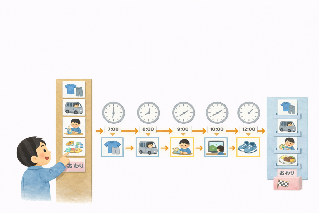 友セカンドの建物写真の次に洋服、笑プラス(通所先)、再び友セカンド、ラジカセ、そして布団のイラストが提示されていますね。すなわち、「朝は着替えて通所へ行き、帰ってきたら音楽鑑賞をして過ごし、夜は寝て休んでおしまい」の意味が伝わります。(土日の欄はその応用編で帰省の予定が入っています)