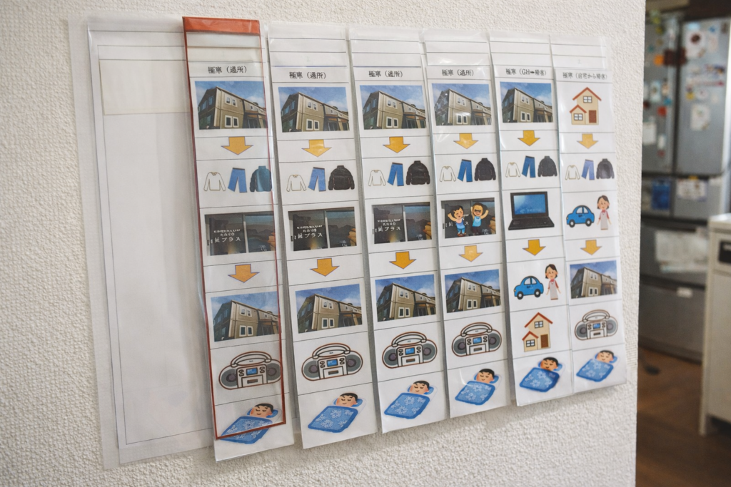 こういったスケジュールを駆使してグループホームでの生活を把握されていますが、個々に専用のツールがある為、他利用者様の場合はまた違ったスケジュールを居室に貼って目安にしています。